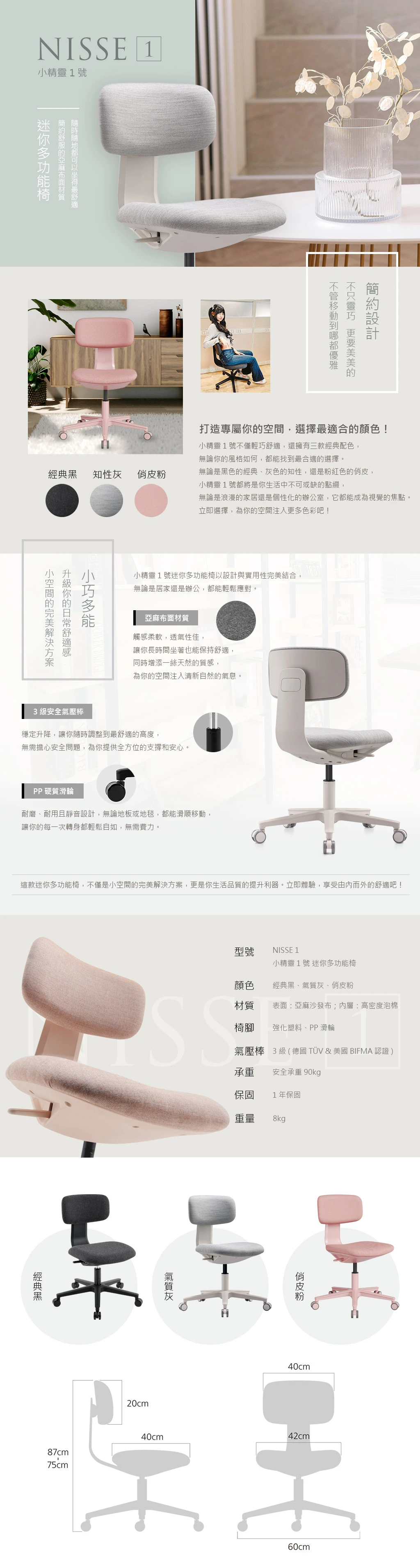 {{emb:products-main/banner}}產品系列:: :: NISSE 1 小精靈1號 迷你機能椅功能 • 隨時隨地都可以坐的最舒適 • 簡約舒服的亞麻布面材質 • 椅座高度可調 • 360度全方位旋轉 • 商品須自行簡易安裝,組裝前請詳閱說明書規格 經典黑,氣質灰,俏皮粉價格NTD $ 3980 元 3980運費 NTD $ 250元 (購物滿 2000元免運費)數量:商品說明